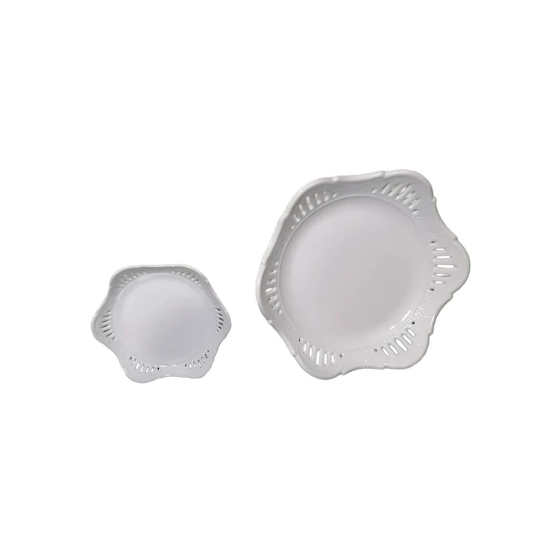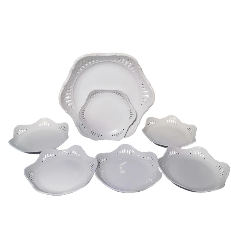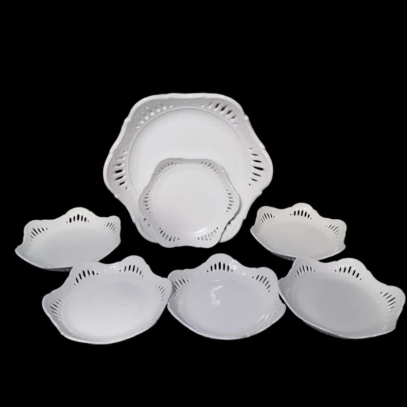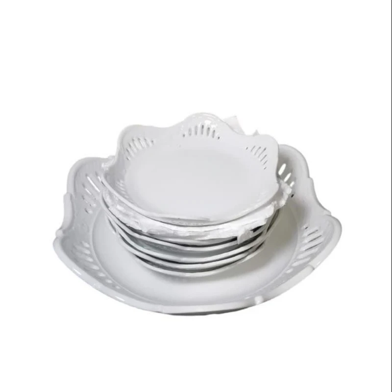 این سرویس پذیرایی زیبا شامل 6 عدد پیش دستی 15 سانت که مناسب شیرینی خوری می باشد است و شامل 1 عدد شیرینی خوری 25 سانت می باشد طرح کلی سفید ساده است و مناسب پذیرایی های کلاسیک است